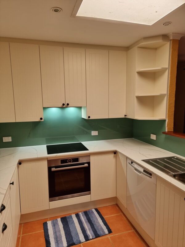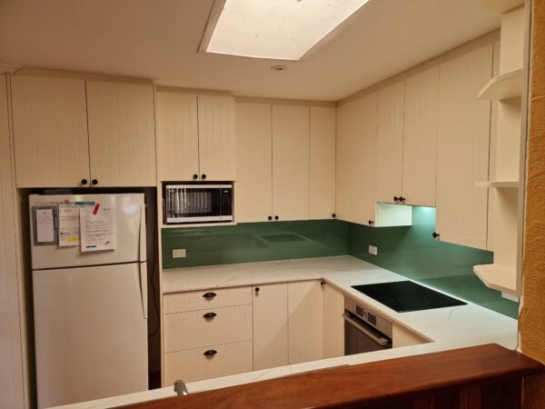 Glass splashbacks – Gumleaf including 2 GPO cut-outs: t Templated, delivered and installed